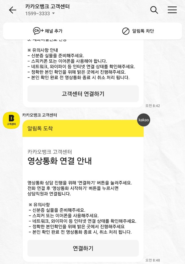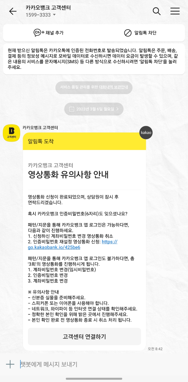 카톡메시지가 온 지 오분 뒤에 음성전화로 상담원의 연락이 왔다. 음성통화를 한 이후에 두 번째 사진처럼 영상통화 '연결하기'의 카톡이 온다. 이때 음성통화를 끊지 않고 '연결하기'를 누르면 영상통화로 영상이 바뀐다. 영상통화시에는 내 얼굴만 보이게 된다. 본인이 맞는지에 관한 확인절차이다. 영상통화가 끝나고 비밀번호 재설정과 함께 6자리 앱 비밀번호도 넣어야 하니 6자리 비밀번호도 모른다면 비밀번호 재설정 시에 상담원분께 얘기하면 이것도 해결이 된다.